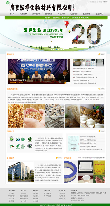广东泓桦生物材料有限公司座落在拥有茵茵绿洲的东莞松山湖台湾高科技园。利用"生物降解树脂组合物及其制备方法"等多项自主知识产权,致力于:利用可再生农业资源,研 发、生产和销售"可完全生物降解树脂-Biodegradable Starch Resin,简称BSR"绿色高分子材料及其系列环保产品。